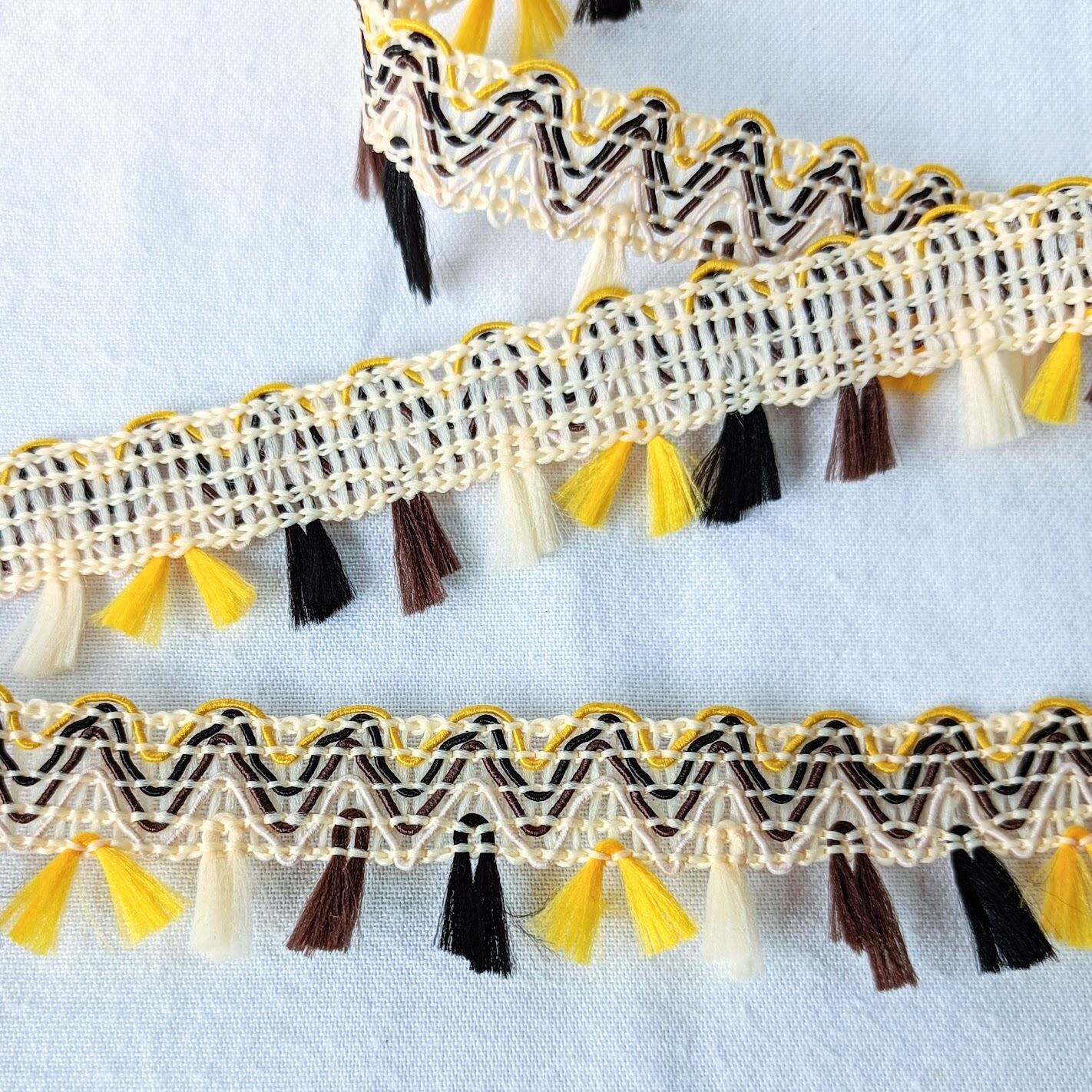 白、黄、黒、茶のミックスカラーのフリンジリボンです。