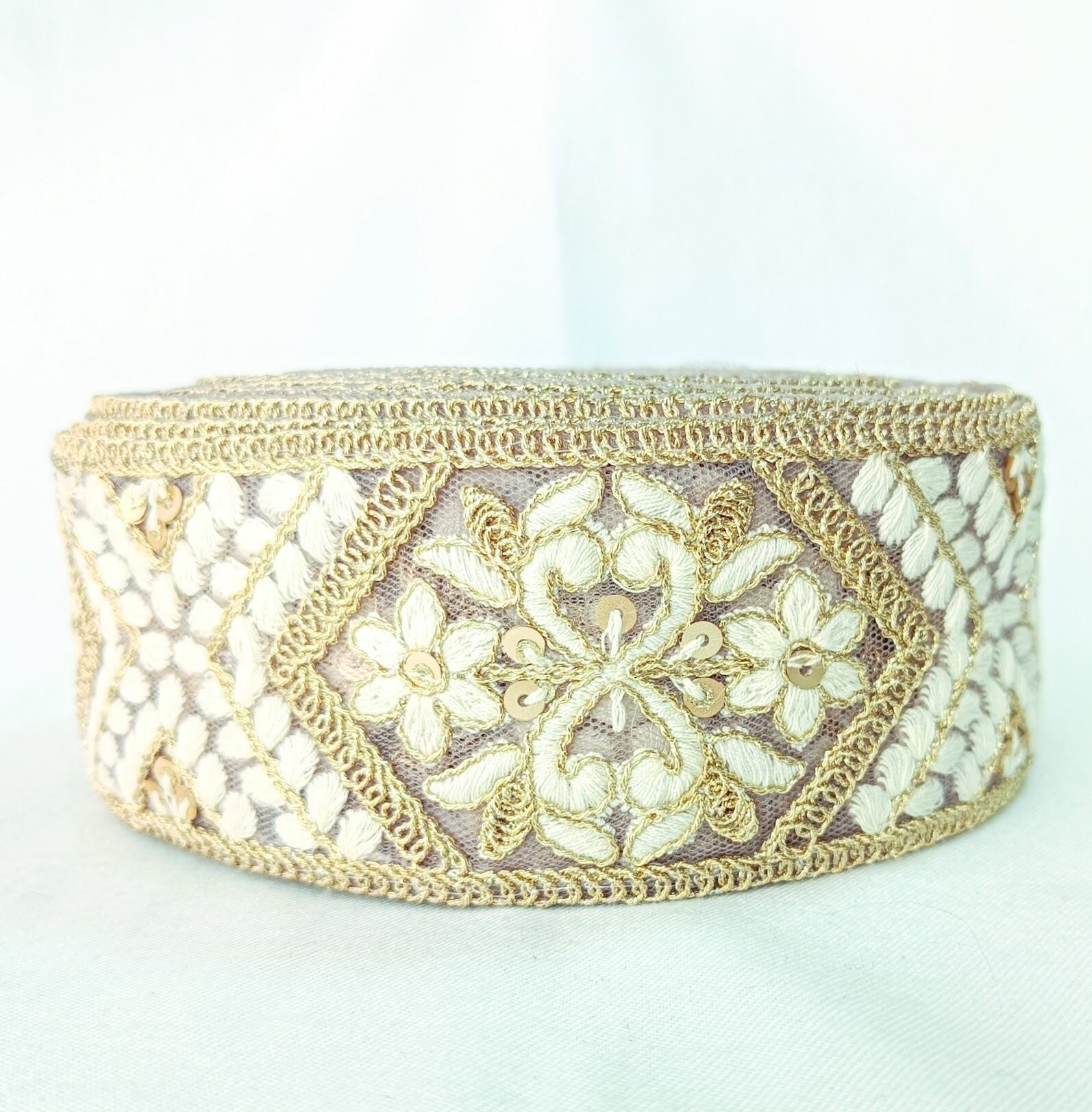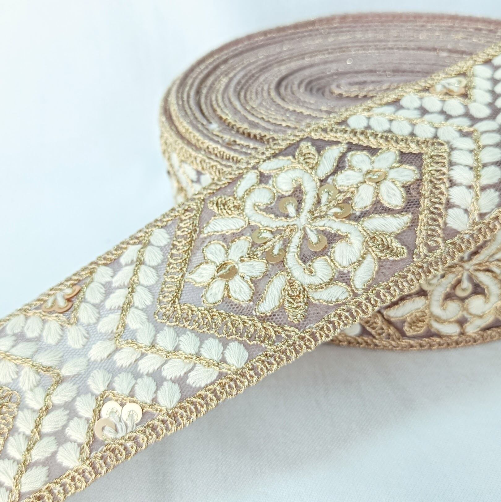 金糸とスパンコールを使った、ゴージャスな刺繍が施されたレースリボンです。