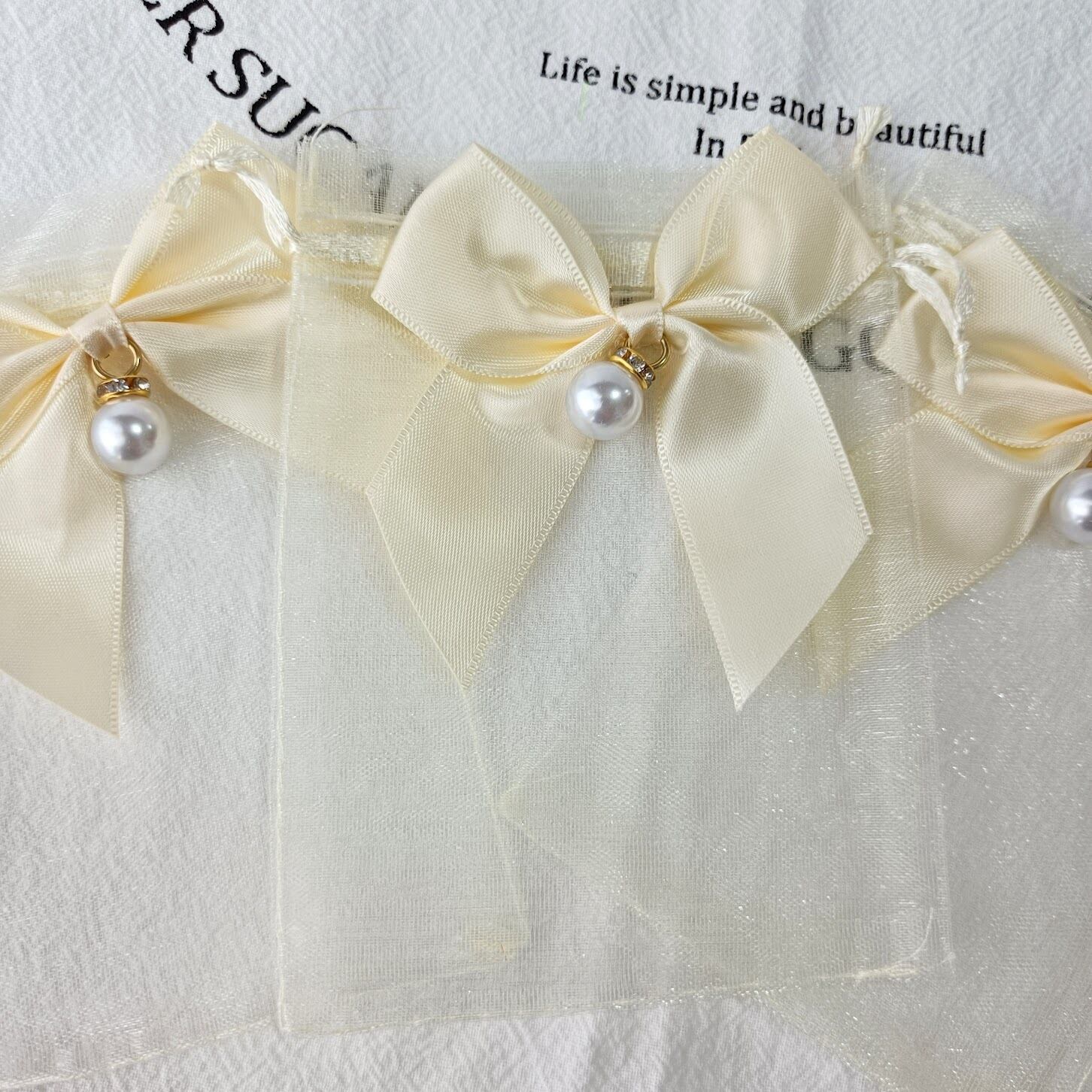 【6枚】【オフホワイト】オーガンジー フェイクパール付き リボン付き ラッピング袋 ラッピング ギフトバッグ 包装 巾着ポーチ 小物入れ