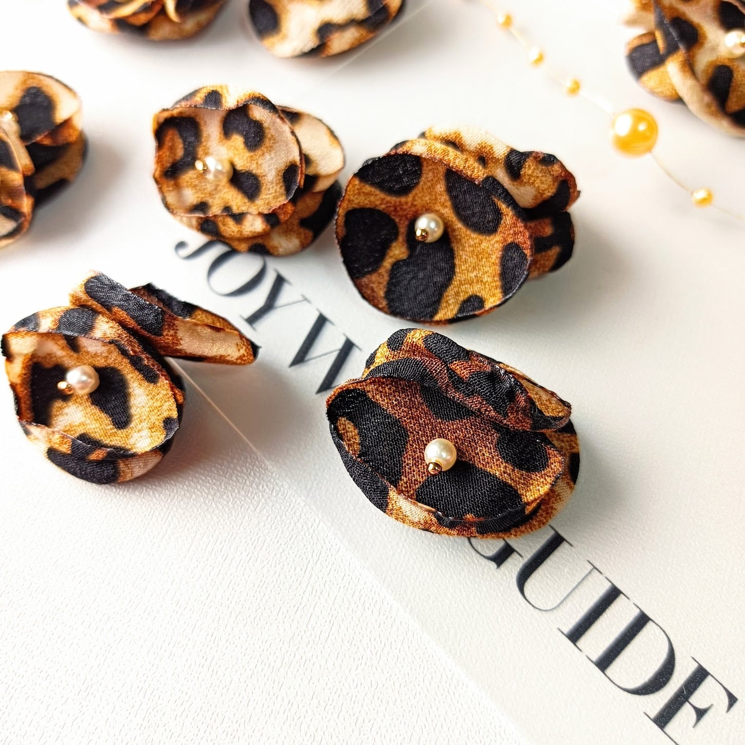 【4個】カン付き レオパード オーガンジーフラワー 3連 シフォンフラワー チャーム アクセサリパーツ ハンドメイド F006