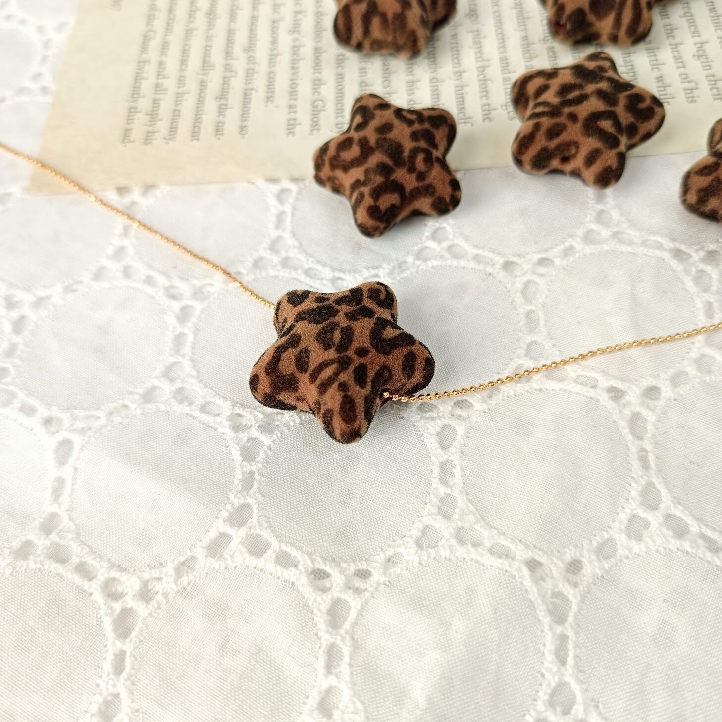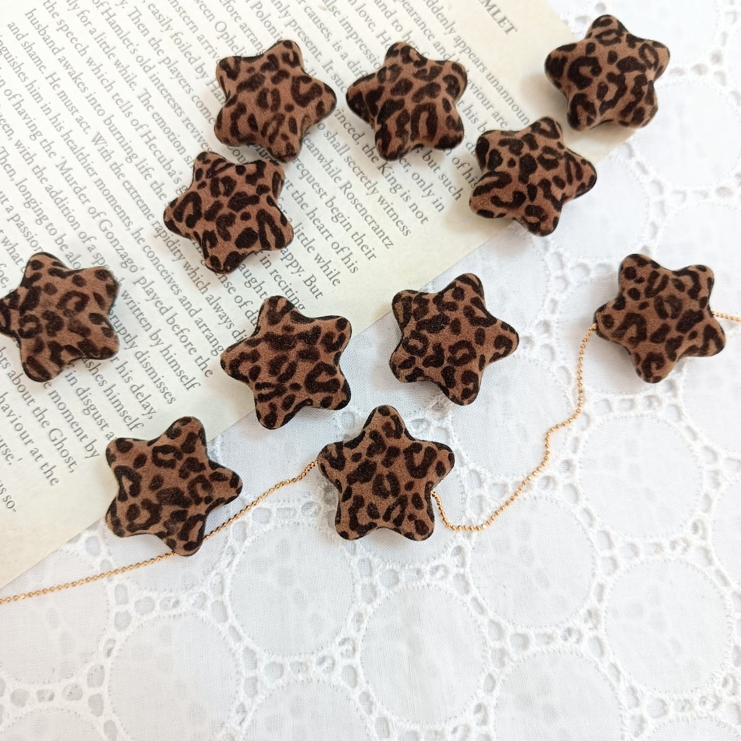 【6個】レオパード スター フロッキービーズ ベロア調 星形 豹柄 貫通穴 デコパーツ アクリルビーズ ハンドメイド AB142