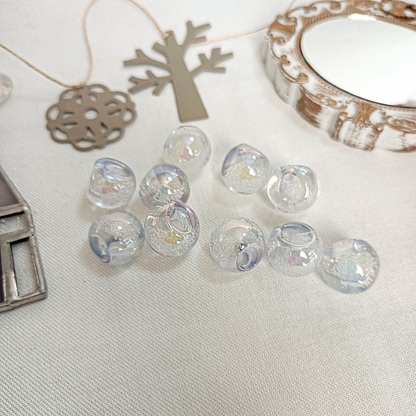 小さいなバブルが閉じ込められたオーロラ鈴丸ビーズです。