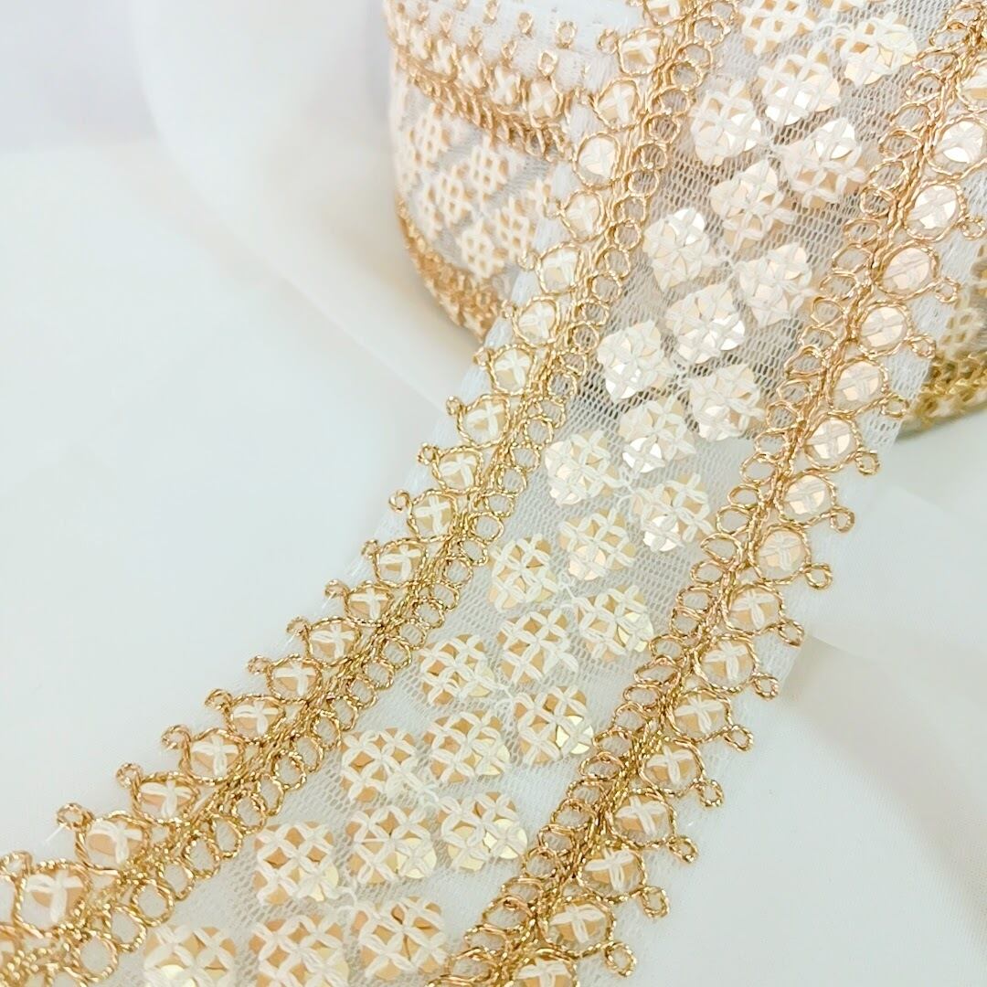 【50cm】【オフホワイト】インド刺繍リボン マットゴールド 淡い色 菱形 レース地 スパンコール 手芸 アクセサリーパーツ ハンドメイド DIY R025