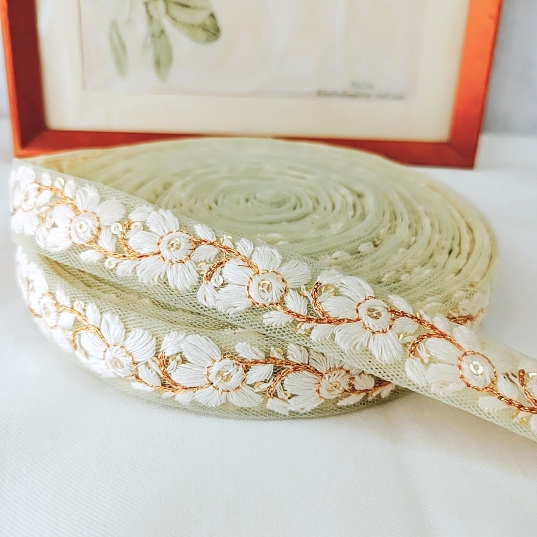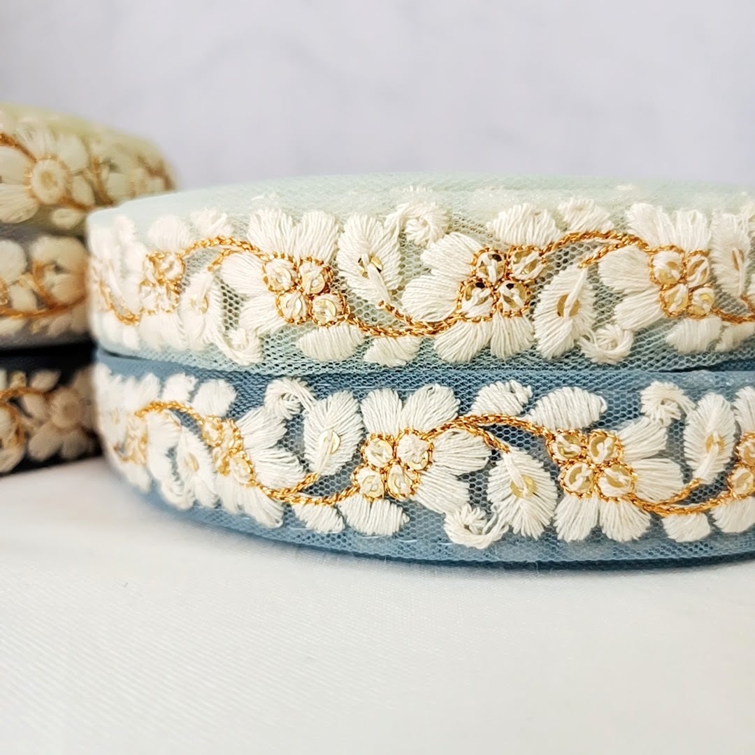 【50cm】【20mm幅】細め くすみカラー インド刺繍リボン フラワーモチーフ フリンジ 淡い色 レース地 スパンコール 手芸 アクセサリーパーツ ハンドメイド DIY R027