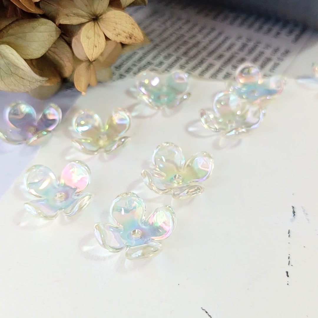 【24pcs】【15mm】オーロラクリア 小ぶり 4弁フラワー フラワービーズ アクリルフラワー アクセサリーパーツ ハンドメイド DIY