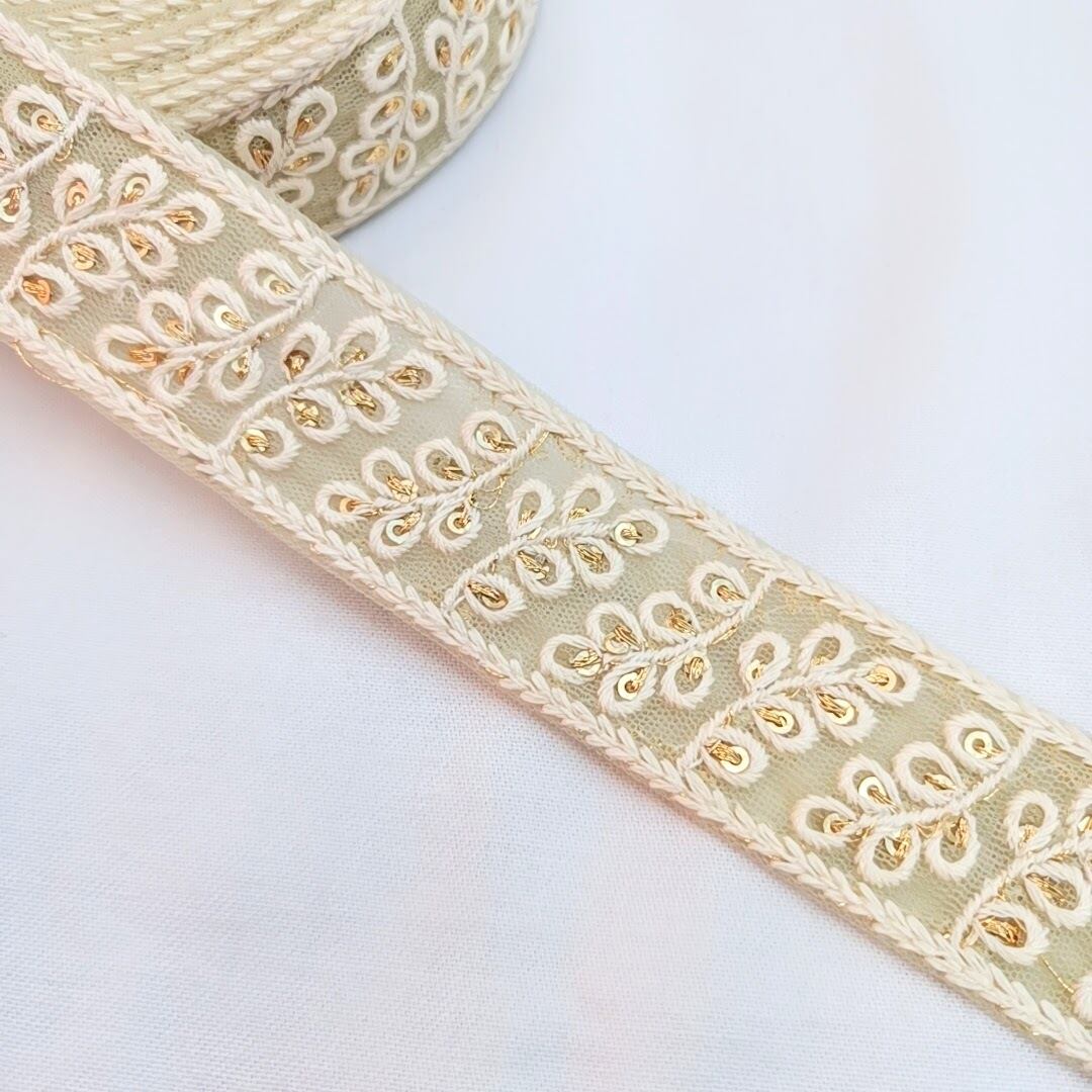【50cm】【30mm幅】細め インド刺繍リボン ホワイト刺繍 リーフ ハンドメイド 手芸 R039