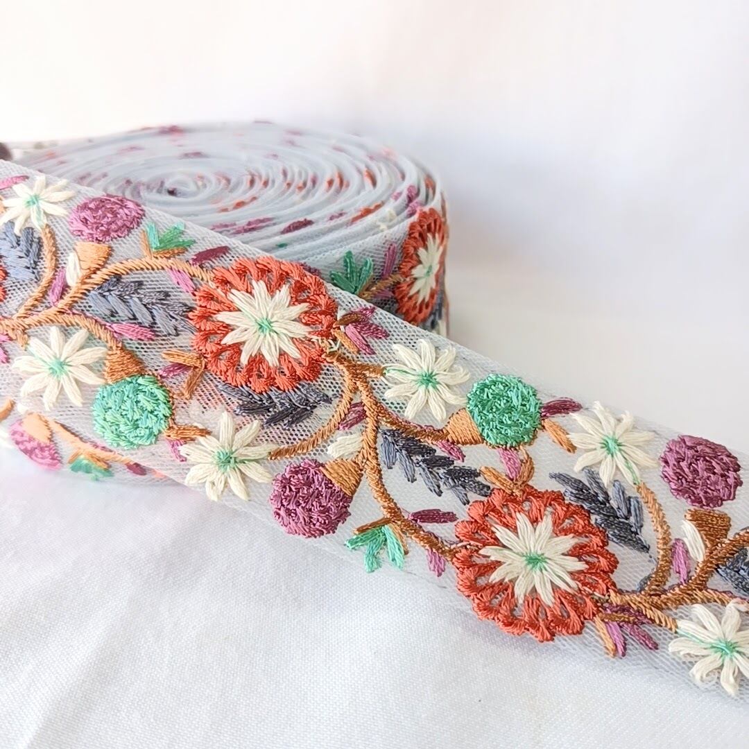 カラフルのフラワーモチーフのインド刺繍リボンです。