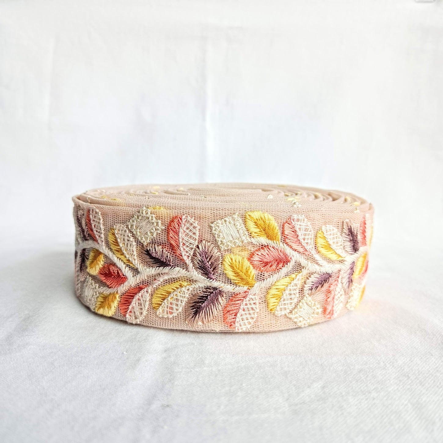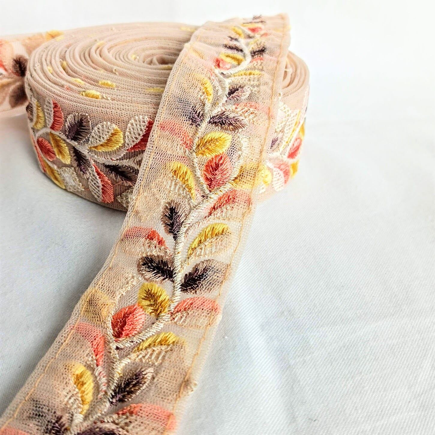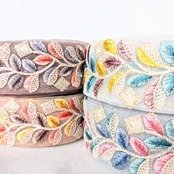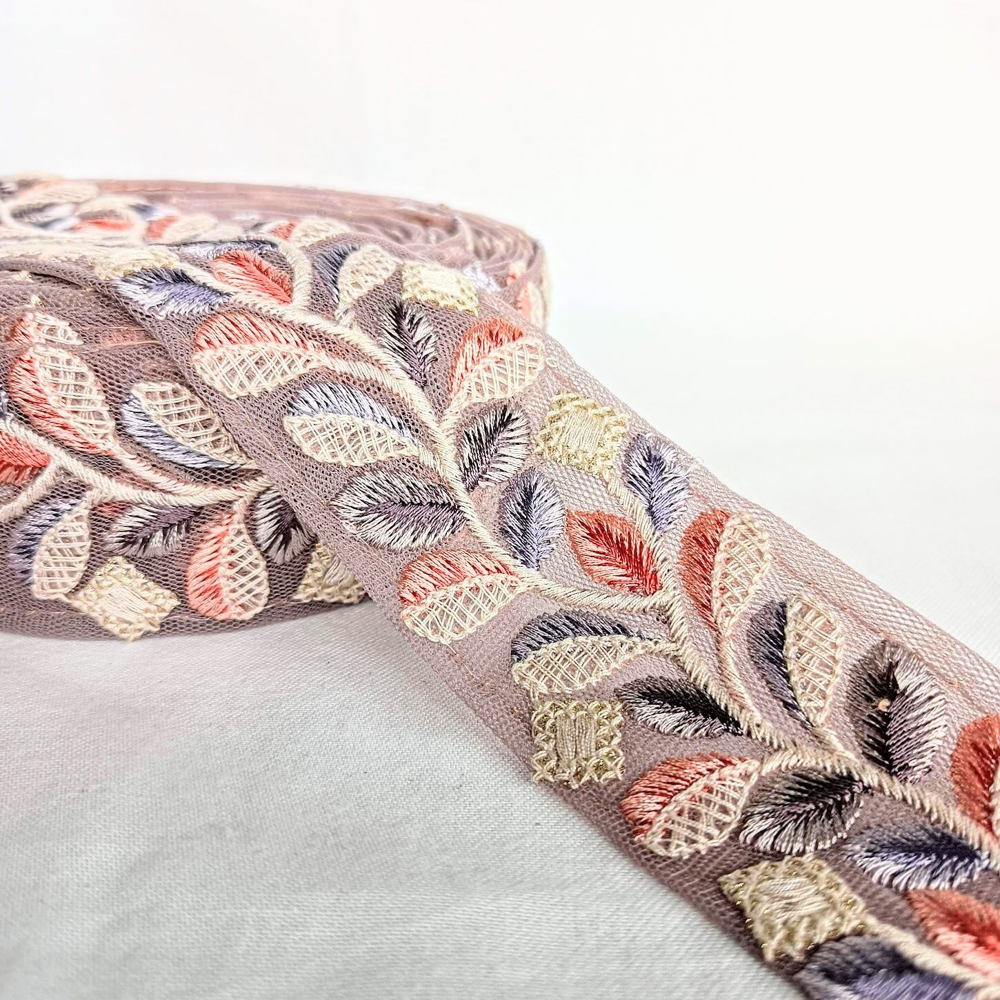 【50cm】【45mm幅】インド刺繍リボン くすみカラー レトロ リーフモチーフ シンプル ハンドメイド 手芸 R061