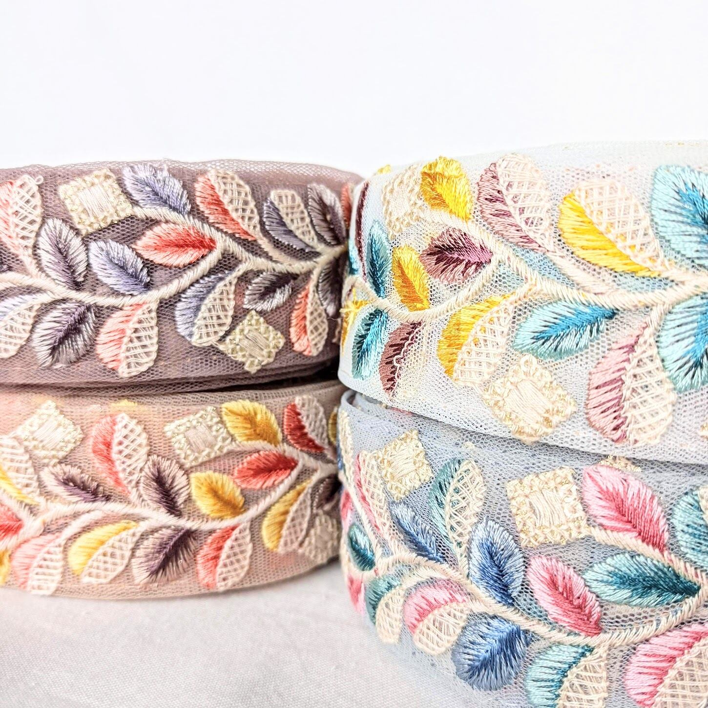 くすみカラーのインド刺繍リボンです。