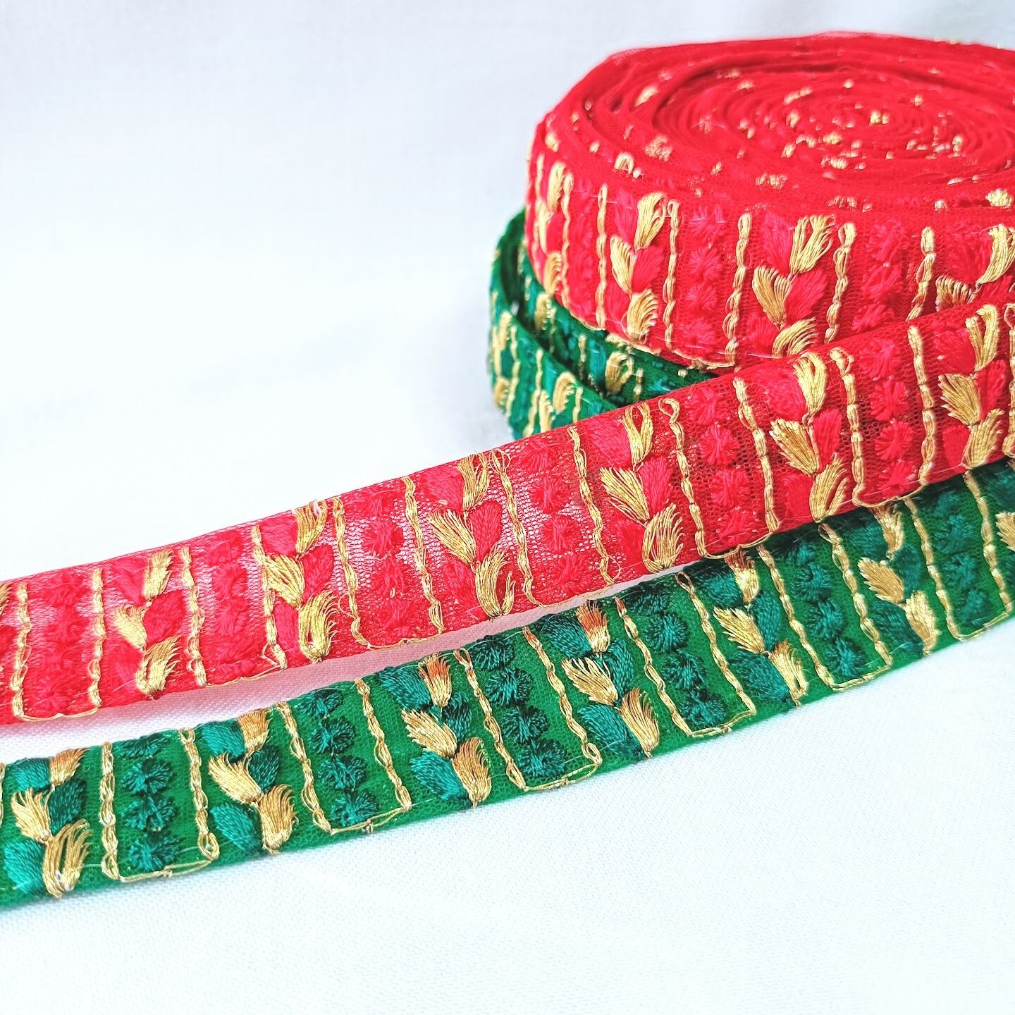 【50cm】【24mm幅】インド刺繍リボン クリスマスカラー リーフ 細め 刺繍 手芸 アクセサリーパーツ ハンドメイド DIY R080