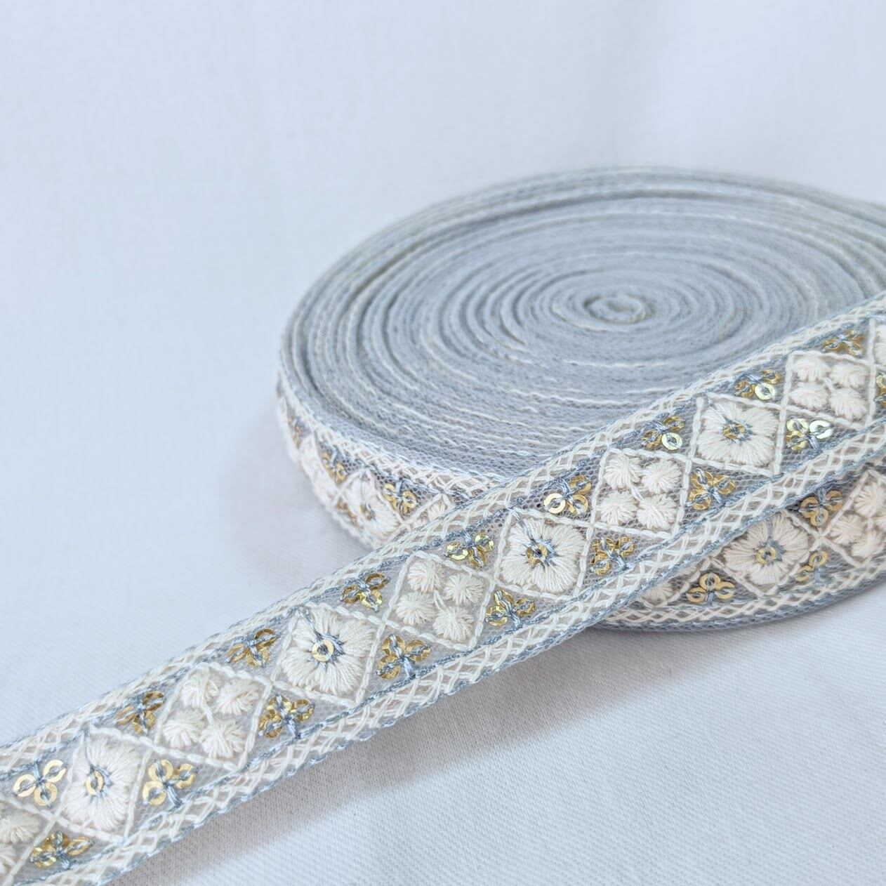 【50cm】【25mm幅】くすみカラー インド刺繍リボン フラワーモチーフ フリンジ 淡い色 レース地 スパンコール 手芸 アクセサリーパーツ ハンドメイド DIY R097