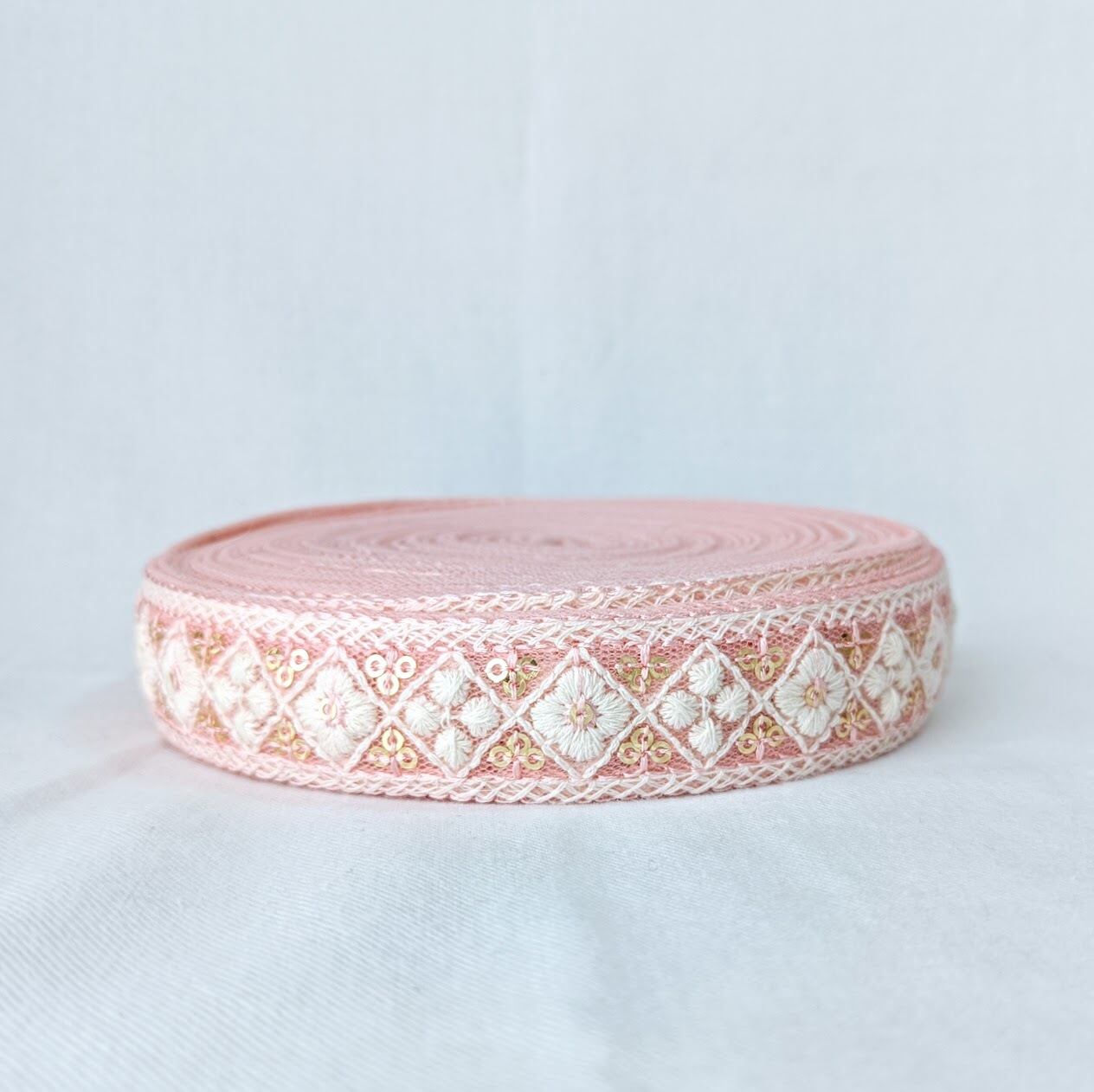 【50cm】【25mm幅】くすみカラー インド刺繍リボン フラワーモチーフ フリンジ 淡い色 レース地 スパンコール 手芸 アクセサリーパーツ ハンドメイド DIY R097